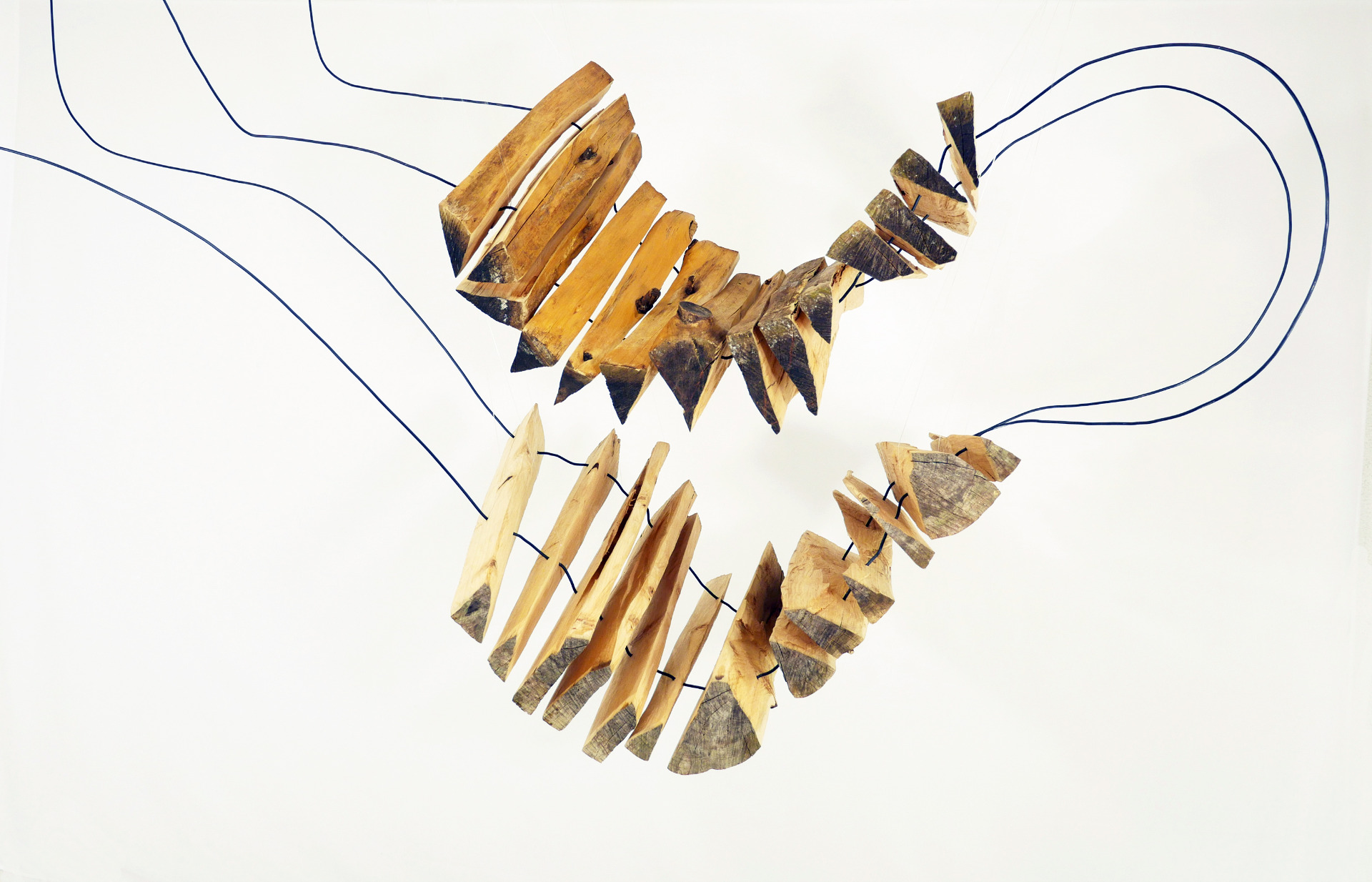 Part of series of suspended wood sculptures started in 2025, using the fallen trees and wood from her late grandparents garden and black wire Parte de série de esculturas suspensas em madeira, iniciadas em 2025, com arame preto e madeira de árvores abatidas do jardim dos seus avós.